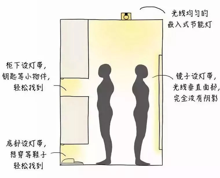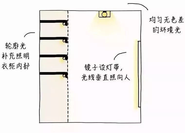 衣柜的局部照明,是為了方便使用者在打開衣柜時(shí),能夠看清衣柜內(nèi)部的情況。衣帽間需要均勻、無色差的環(huán)境燈,鏡子兩側(cè)設(shè)置燈帶,衣柜和層架應(yīng)有補(bǔ)充照明。最好選用發(fā)熱較少的LED產(chǎn)品▼