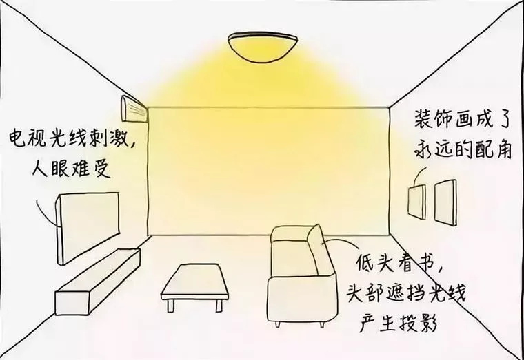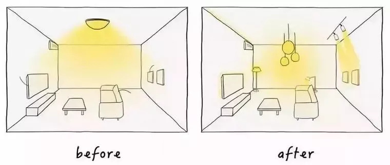一般人都會想,房間只要夠亮就行了,于是就出現(xiàn)了下面這種“一盞熒光燈or吸頂燈走天下”的死板場景 ↓