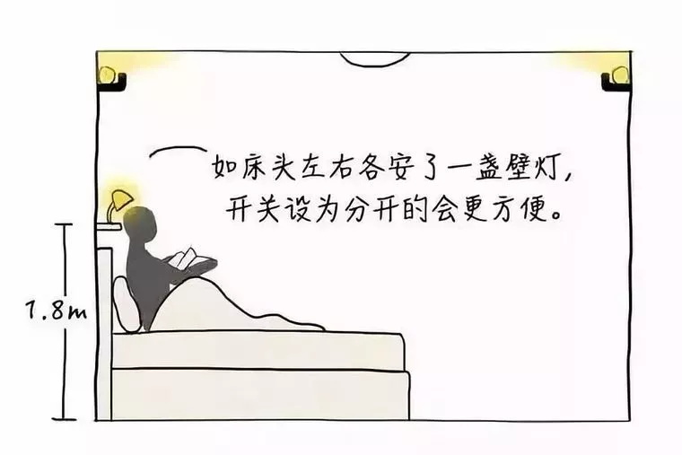 枕邊的局部照明是為了讓人在床上進(jìn)行稅前活動和方便起夜設(shè)置的。可以在床頭距地約1.8m的兩段墻壁,安裝不占空間的壁燈?;蛘咴O(shè)置床頭柜臺燈或者落地?zé)粢部梢渊?/span>