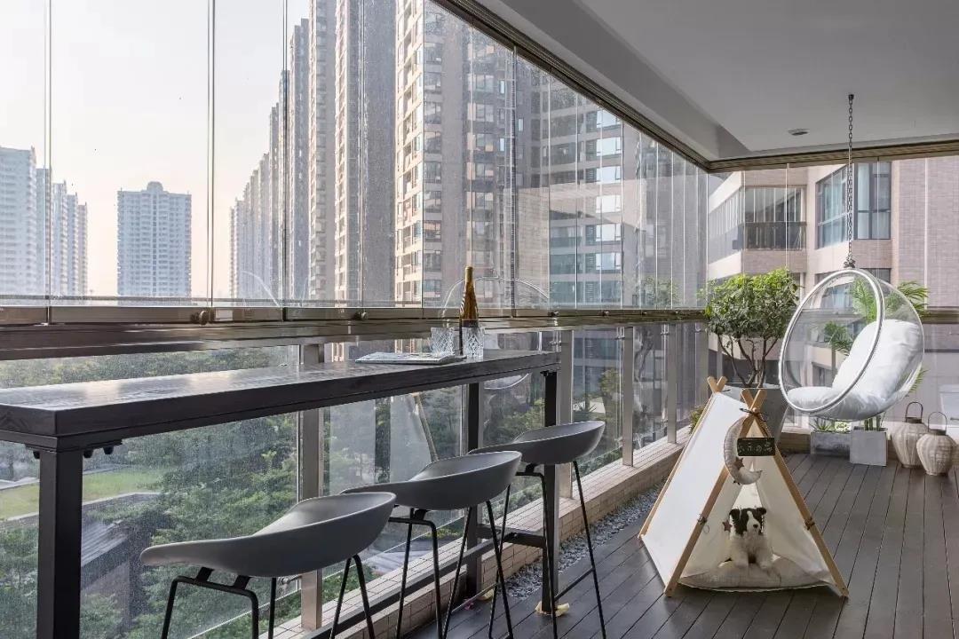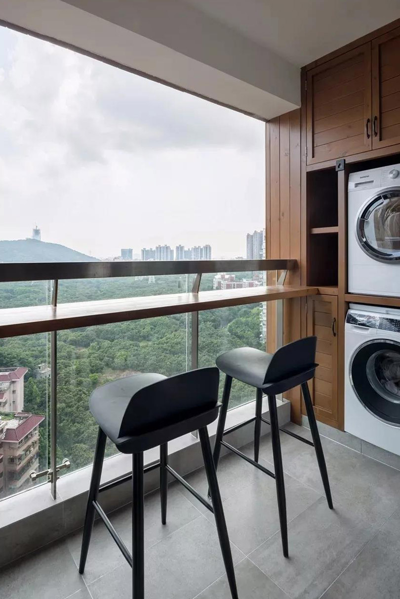 陽臺處在正對室外的位置,視野敞亮,吧臺設計在這兒,無論是喝下午茶,看書還是工作,都是不錯的選擇,讓人能暫時忘記生活的茍且,享受一段詩和遠方。